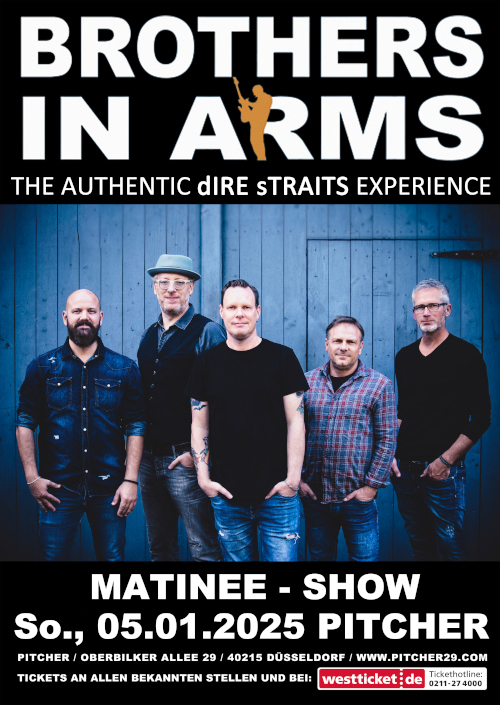Einlass 15 / Beginn 16 Brothers in Arms nicht nur diesen Song kennen dIRE sTRAITS Fans, sondern auch die vielen anderen Welthits der großartigen Band um Mark Knopfler. Konzertfreunde bedauern jedoch, dass gerade diese Band schon lange nicht mehr Live zu erleben war. Über 40 Jahre Dire Straits und eine Bühnenabstinenz seit rund 30 Jahren gaben Anlass, den musikalischen Waffenbrüdern eine Art Renaissance zu verpassen. So war es naheliegend, dass sich für die im Jahr 2002 gegründete Formation “Brothers in Arms” eine Handvoll auserwählter Musiker fand, die es nicht nur verstehen, die Hits sondern auch den Geist und die Atmosphäre von dIRE sTRAITS live zu reproduzieren. Seit nunmehr 23 Jahren gehören „Brothers in Arms“ zu den erfolgreichsten Tribute Bands im Lande und das mit einer von Jahr zu Jahr wachsenden Fangemeinde und weit über dieGrenzen Deutschlands hinaus. Das Programm Das über 2-stündige Programm führt den Zuhörer nicht nur durch die musikalische Geschichte der dIRE sTRAITS. Die Show, Präsenz und vor allem der hohe musikalische Anspruch der Band, überzeugte in bisher rund 1000 Live-Shows die Konzertbesucher und spricht für eine professionelle Performance. “Brothers in Arms” waren bei Ihrer Gründung 2002 europaweit die erste dIRE sTRAITS Tribute Show, stehen dem Original in nichts nach und versprechen ein beeindruckendes musikalisches Live-Erlebnis. Von Expresso Love, Sultans Of Swing, Telegraph Road, Money For Nothing über Latest Trick bis hin zu Brothers In Arms fehlt keiner der legendären Hits. Ein absolutes Muss für jeden Fan dieser legendären Band!