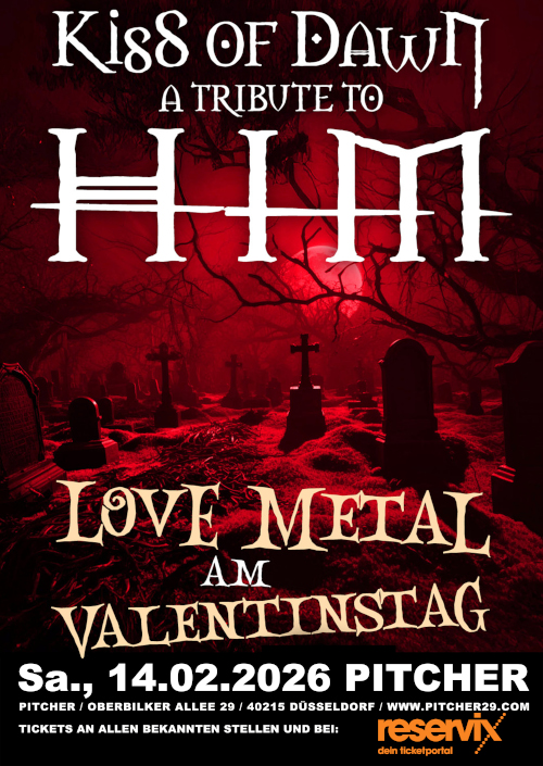 "HEL(L)AU DÜSSELDORF – Valentinstag mit „LOVE METAL“ Kiss of Dawn - a tribute to HIM 📍 Düsseldorf Pitcher 📅 Sa., 14.02.2026 ⏰ Einlass 18 / Show 20 Uhr (Fastnachtssamstag und Valentinstag) 🎟️ Tickets: https://www.westticket.de/.../kiss-of-dawn-pitcher-20123615 Nachdem wir in Fulda praktisch eine Fastnachts-Gegenveranstaltung mit unserem „Gothic Metal Night“-Projekt am Valentinstag 2025 zusammen mit unseren Freunden von „a Night in Temptation“ erfolgreich über die Bühne gebracht haben, wird es Zeit für größere Herausforderungen! 🤣 Also warum nicht Düsseldorf zur Karnevalszeit 2026 – mehr Herausforderung geht nicht, oder? Wer nix probiert, verliert! 😎 Wir freuen uns auf unseren ersten Besuch in der NRW-Landeshauptstadt im Pitcher – Rock’n’Roll Headquarter Düsseldorf! Das wird ein Spaß! 🖤❤️🤘 Eure Kiss of Dawn – und (fast) wie immer wünschen wir Euch: BLEED WELL IN HELL(AU) 🥸 #KissOfDawn #LoveMetal #Valentinstag #Fastnacht #Karneval #Hellau #Düsseldorf #PitcherDüsseldorf #GothicMetal #MetalNight #LiveMusic #MetalLive #ValentinesDay #NRW #RocknRoll #BleedWellInHell zu Kiss of Dawn – a tribute to H.I.M. Man schrieb das Jahr 2018, als sich ein paar Musiker aufmachten, um den düsteren, melancholischen und leidenschaftlichen Klängen der Finnen von H.I.M. Tribut zu zollen. Die Band H.I.M. hatte am 31.12.2017 ihr aktives Dasein mit einem Konzert in ihrer Heimat in Helsinki nach über 25 Jahren Bandgeschichte beendet. Die Mission war klar: es sollte dieselbe Leidenschaft wie beim Original auf die Bühne gebracht werden und man wollte die Menschheit mit den melancholischen Klängen in tiefer Depression zurücklassen, aber trotz allem auch ein bisschen schwarzen Humor und eine Portion Sarkasmus verstreuen. Kiss of Dawn bietet einen breiten Einblick in die über komplette Schaffenszeit von H.I.M., musikalisch haben wir sowohl für Metal-, Hard-Rock, Rock- aber auch Pop-Fans garantiert etwas Passendes dabei. In diesem Sinne wie immer – BLEED WELL IN HELL!"
